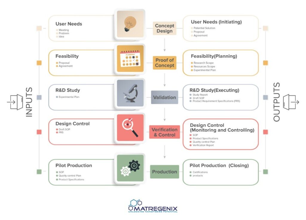 Through this close integration, customers gain direct access to Matregenix’s Contract Design and Development (CDD) team, supporting projects from early-stage nanofiber concepts and prototypes through to scalable, market-ready solutions.Our process begins with a thorough understanding of your target application, performance requirements, and design inputs. In collaboration with Matregenix’s R&D team, we translate these inputs into a defined target product specification, allowing for rapid feasibility assessment before full development begins. Leveraging Matregenix’s established nanofiber formulations and extensive materials library, prototypes can be produced efficiently for initial evaluation. Throughout the development lifecycle, our teams maintain close communication to ensure technical alignment, transparency, and on-time progress.This collaborative model allows ElectrospinTEK customers to go beyond equipment ownership—accessing the scientific depth, formulation expertise, and development infrastructure of Matregenix to accelerate innovation and reduce development risk.